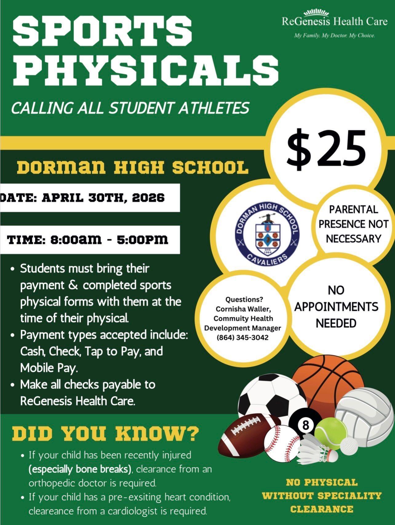 Physical Day will be held onsite at Dorman High School, Dawkins, Fairforest and Gable Middle School! All rising 7th-12th grade students will have the opportunity to get a sports physical for the 26-27 school year.
